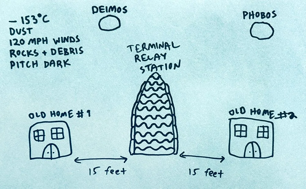 Build a small model of a device, machine or contraption that will take you from either OLD HOME #1 or OLD HOME #2 to The TERMINAL RELAY STATION to exchange Becky. What does your outfit look like? What sensors do you need to survive the outside climate? What futuristic technology will you put to use to survive the short but tumultuous journey? And how will you make it in less than 3 minutes back and forth so that you can each get back for breakfast?